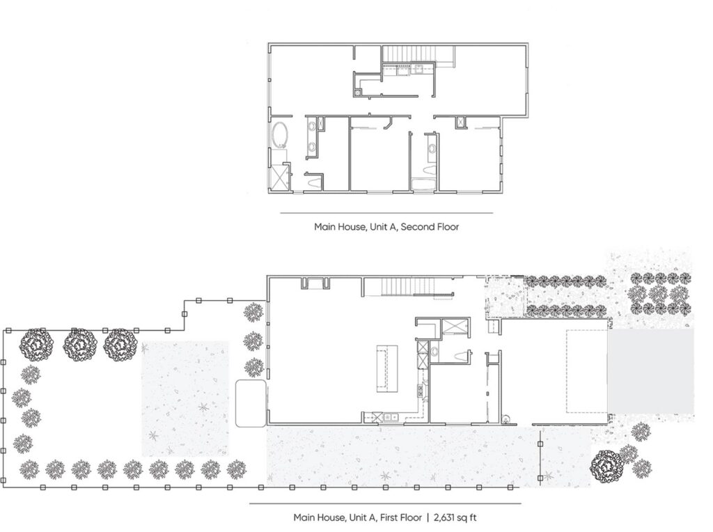 Within the main house, Unit A offers 2,631 sq. ft. of living space. The unit is a two-story, 4-bedroom, 3-full-bathroom home with a 2-car garage. It features a beautifully designed open floor plan with a large kitchen, dining area, and living area. The brand-new kitchen appliances include a range/oven, dishwasher, refrigerator, washer/dryer, and garbage disposal. The primary bedroom has a walk-in closet, while the primary bathroom includes a walk-in shower, standalone tub, and double-sink vanity. The home also